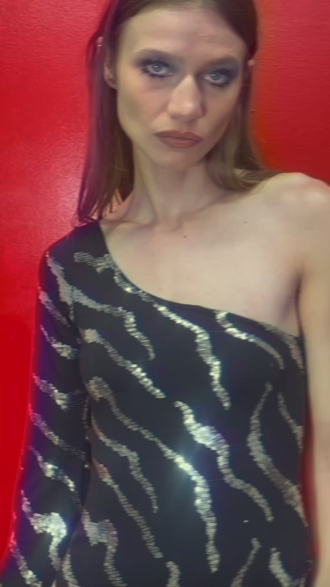 - Stretch black fabric with zebra sequin print, but make it 70s.